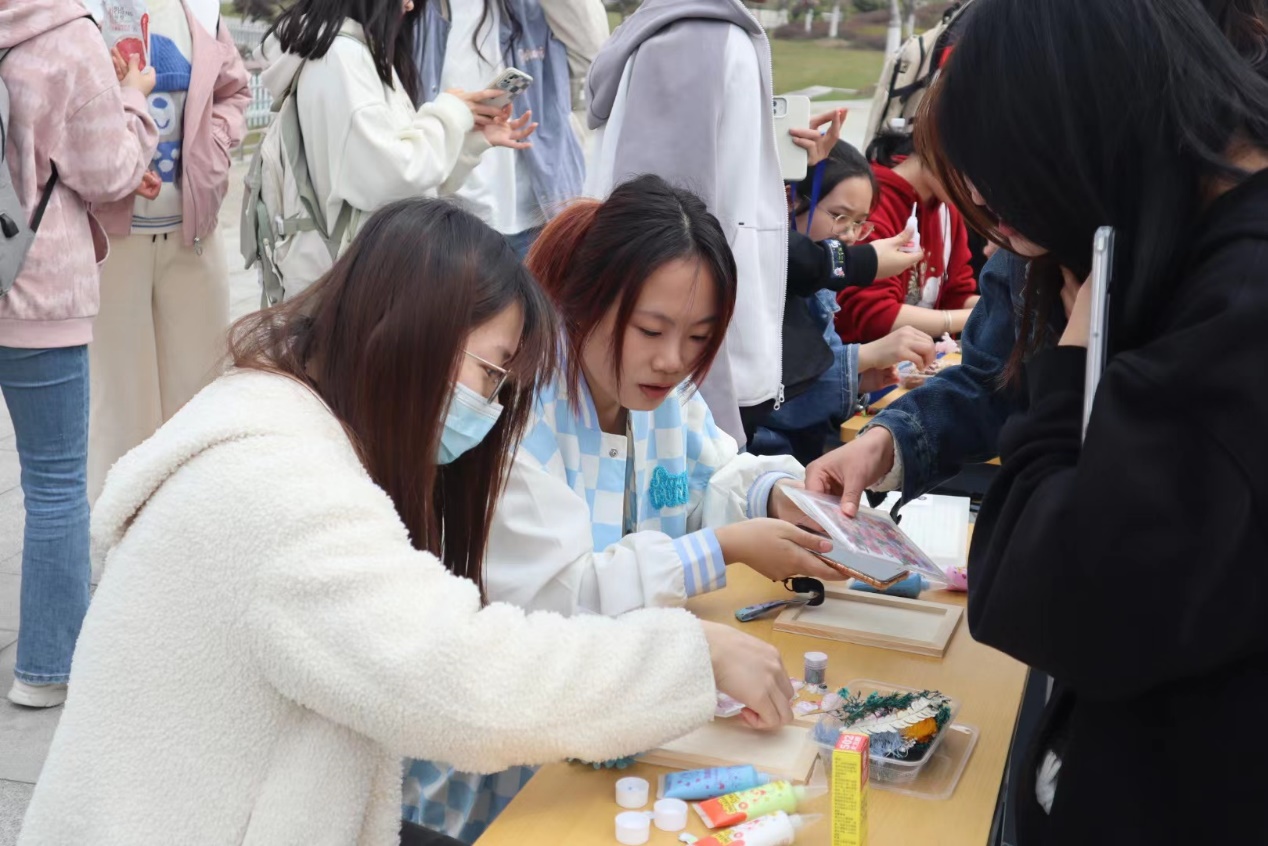 活动现场,同学们在工作人员的指导下,在空白团扇上摆放五彩缤纷的干花,从构图到色彩搭配,再到粘贴制作,大家用慧思巧手制作出独具魅力、摇曳生辉的手工团扇,制作成创意十足、精美立体的干花相框作品。
