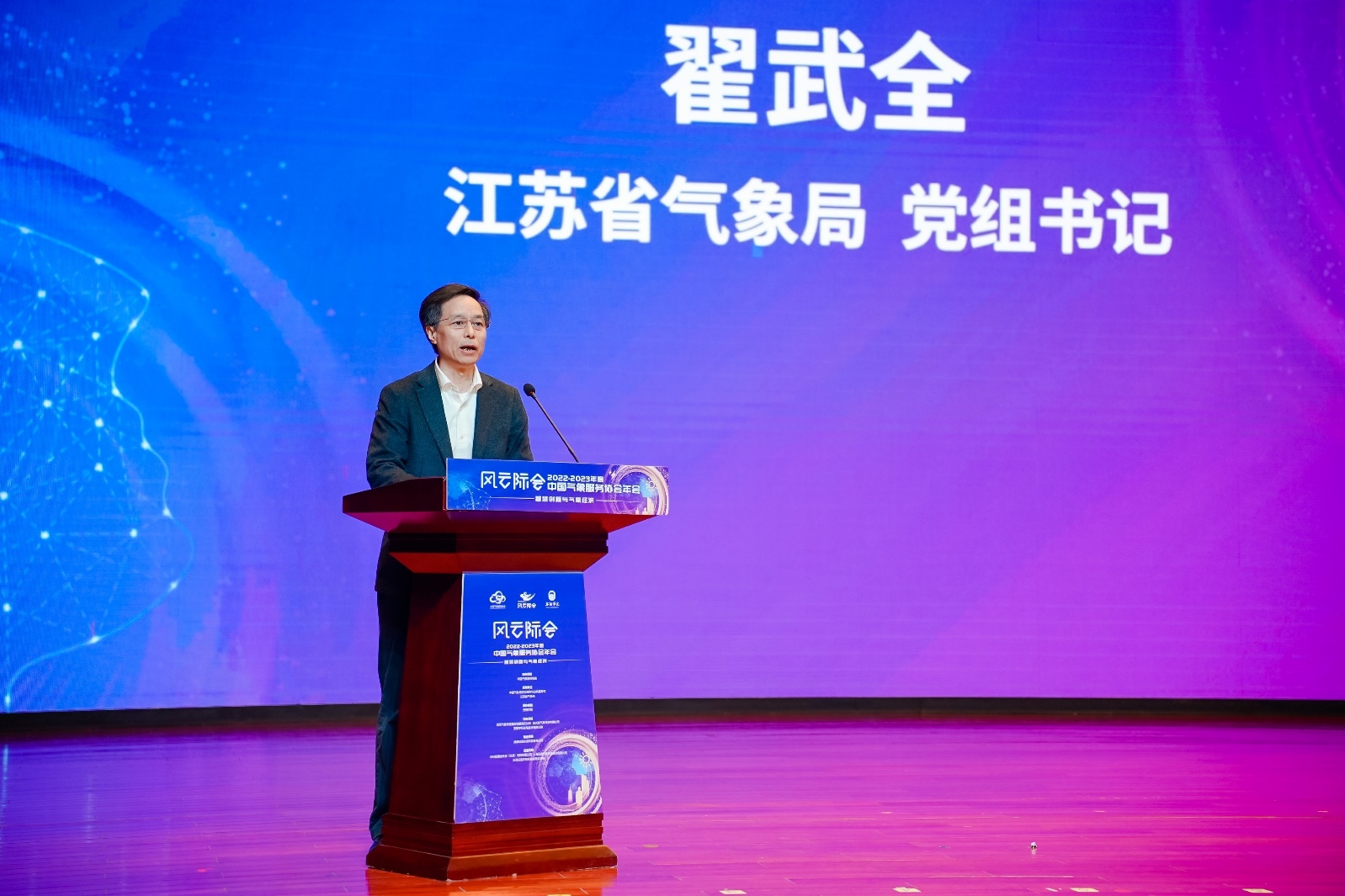 江苏省气象局党组书记翟武全致辞。他表示,未来将大力发展智慧气象服务,不断提升气象服务的准确性、及时性和有效性,用好协会大平台,加强与高校、科研院所、企业、行业协同协作,加大气象核心技术研发及成果转化应用,促进气象领域产学研深度融合,壮大江苏气象科技产业链、创新链,持续推进江苏气象高质量发展取得新成绩。
