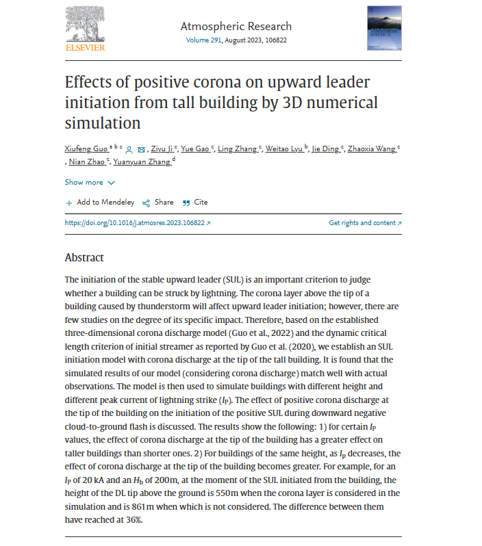 我院青年教师郭秀峰及其团队在国际权威期刊《Atmospheric Research》在线发表了题为” Effects of positive corona on upward leader initiation from tall building by 3D numerical simulation”的研究成果。上行先导的稳定始发是判断建筑物能否被闪电击中的一个重要指标,雷暴环境中的建筑物尖端电晕放电会对上行先导的始发产生影响,但对其具体影响程度的研究还很少。