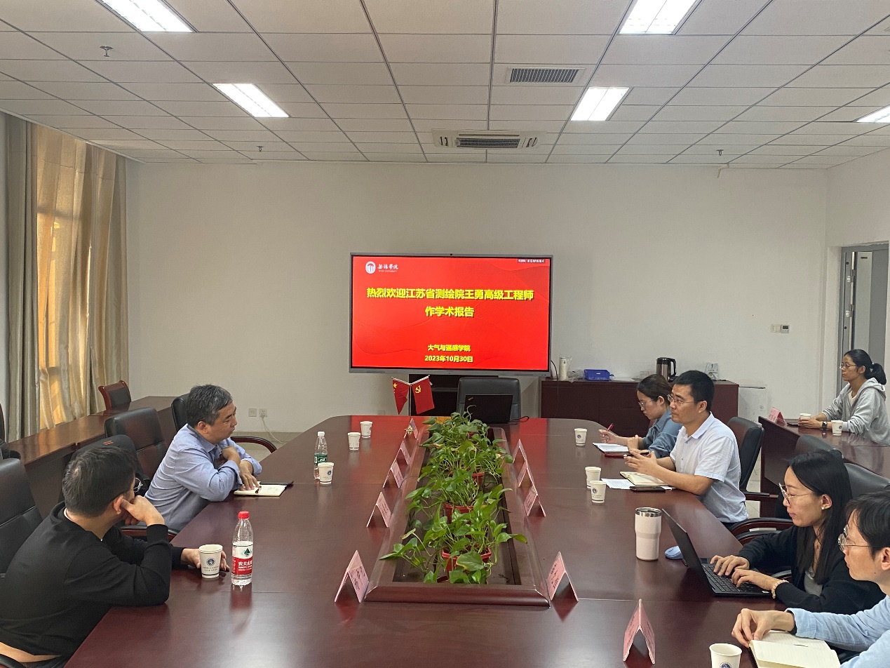 2023年10月30日,大气与遥感学院邀请到了江苏省测绘工程院导航定位中心主任王勇来校作报告,本次报告的主题是《智能化测绘与时空基准》。大气与遥感学院遥感专业负责人蔡鹏主持会议,地理与遥感系教师参加报告会。