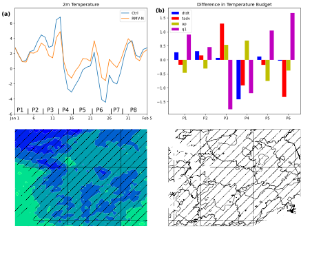 图2 (a)部分侧边界实验中去除北侧边界季节内振荡(ISO)信号后2m气温与原始气温的对比。(b) 去除北侧边界ISO信号后925hPa温度收支方程各项与原始值的对比,蓝柱代表气温变化趋势,红柱代表温度平流,黄柱代表温度绝热加热,紫柱代表非绝热加热作用。(c)去除北侧边界ISO信号后2m气温与原始气温的差异,阴影部分为通过95%显著性检验区域。(d) 去除北侧边界ISO信号后气温、风场与原始值的差异,阴影部分为气温差异通过95%显著性检验区域。