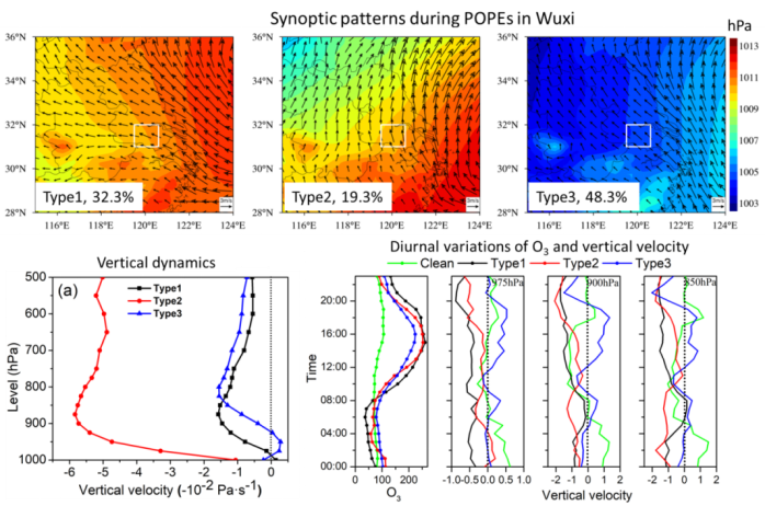 图1无锡市近八年POPEs发生时的三类大气环流型(上),三类环流型下的垂直速度廓线(下左)、不同高度的水平风速和臭氧浓度的日变化(下右)