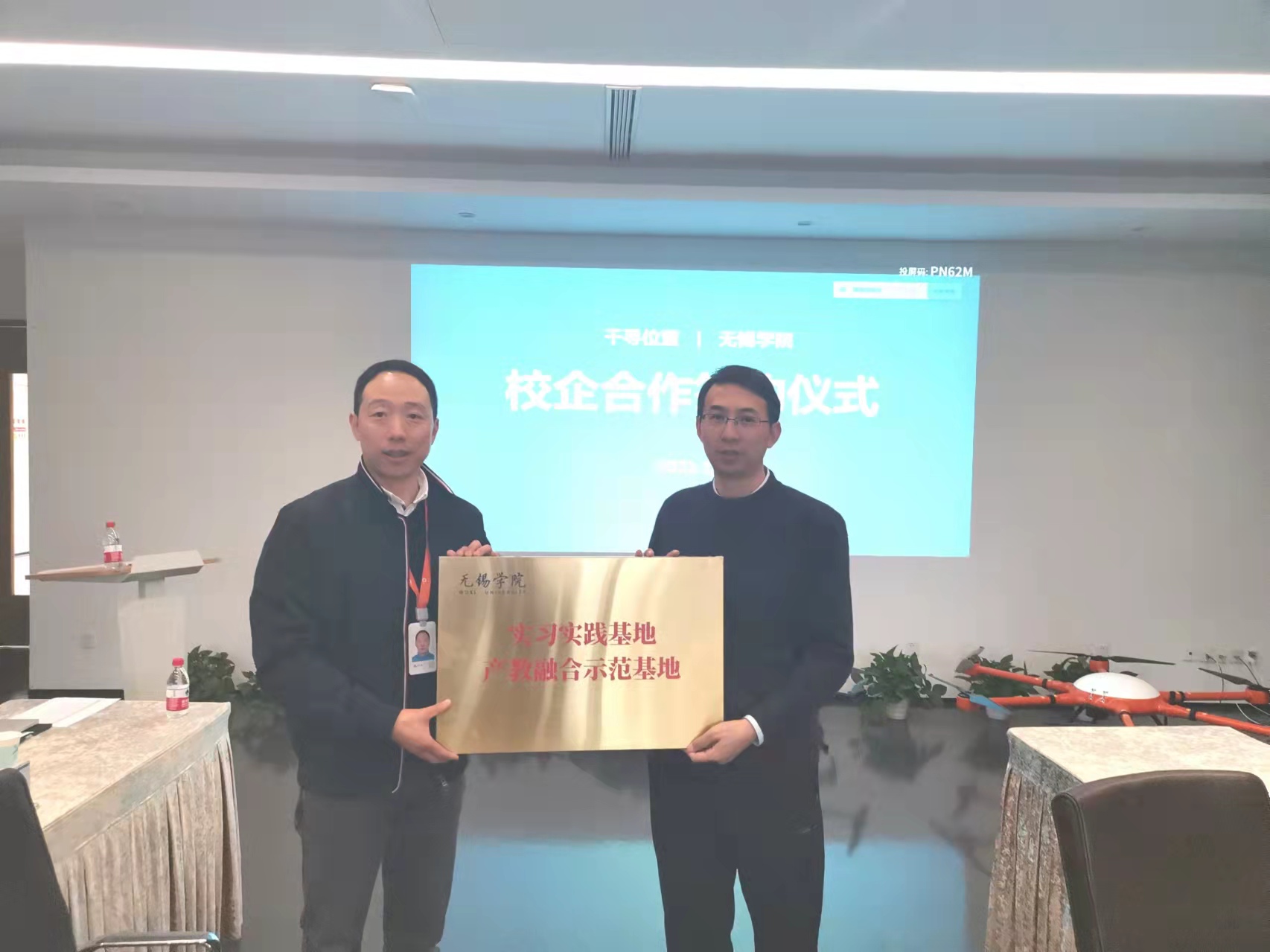 会上,在双方领导的见证下,我校刁一伟和千寻位置公司房靖代表各自单位签署校企合作协议。曹广喜与陈俊共同为实训基地揭牌。