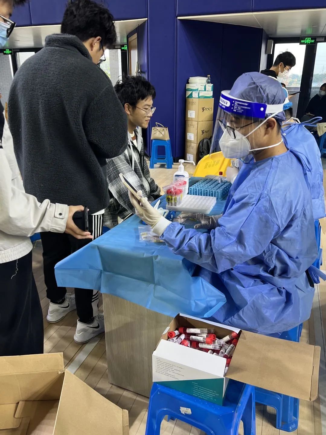 虽已是冬天,但同学们积极高涨的志愿精神不减。对于同学们来说,这次核酸检测不仅仅是一次志愿活动,更重要的是领悟“安全工程”的精神与内涵:“安全至上,生命至上”。负责信息录入的同学们在核酸采集开始前迅速穿好防护服,戴上白手套,给试管贴上条形码;负责测温、维持秩序的同学们提前穿上亮眼的红马甲,站在体育馆门口,静候学生们的到来。排队入场的体温检测,再到信息录入与试管取样,每一个过程都处理迅速、每一个步骤都准确无误。全力确保疫情防控各个环节顺畅衔接、高效运转,为疫情防控筑起坚实防线。十一月的寒风冷酷无情,但体育馆内部,却是温暖如春。正是这些志愿者和医生的无私奉献与坚持不懈,让这偌大的体育馆变得温暖。