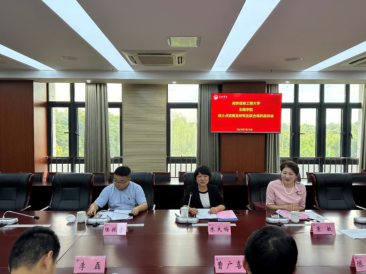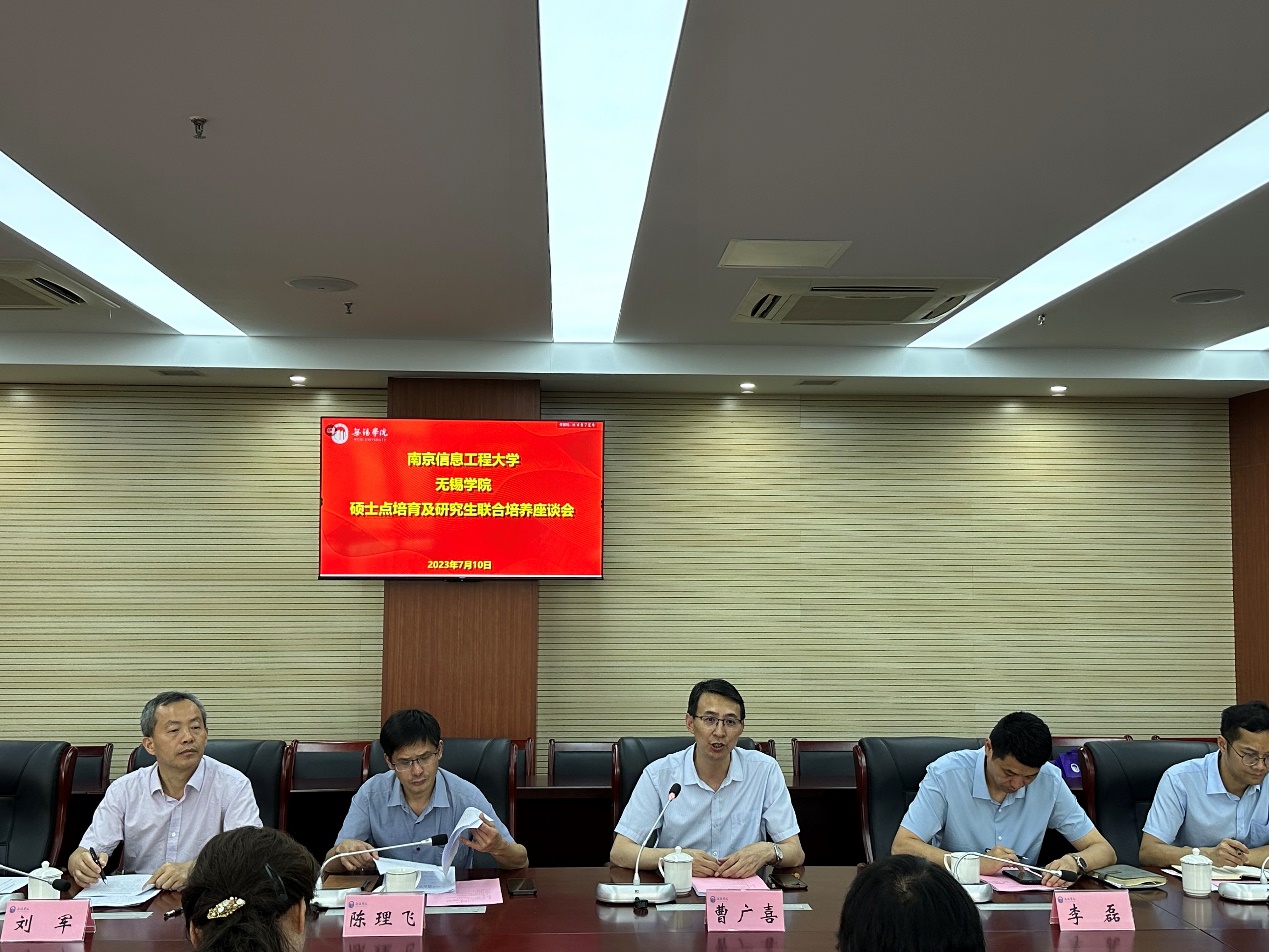 2023年7月10日下午,南京信息工程大学党委常委、副校长朱大梅、研究生工作部部长袁敏、研究生院院长、学科建设处处长陆振宇等一行5人赴我校参加硕士点培育及研究生联合培养座谈会。无锡学院副校长曹广喜、党委校长办公室主任李磊、学科建设与研究生管理处处长陈理飞及相关学院负责人和导师代表出席本次座谈会,会议由陈理飞主持。