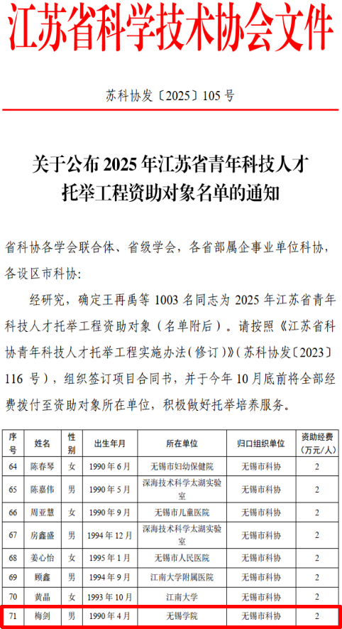 近日,江苏省科协公布了2025年江苏省青年科技人才托举工程资助对象名单,我院梅剑教授凭借突出的科研创新能力成功入选。这一荣誉不仅是对梅剑教授学术成就的充分肯定,更充分体现了我院在高层次人才培养方面取得的显著成效。