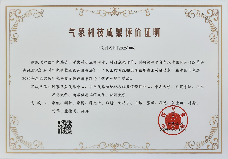 近日,我院教师薛允恒在中国气象局2025年度组织的气象科技成果评价中获得“优秀一等”等级,排名第4/14。