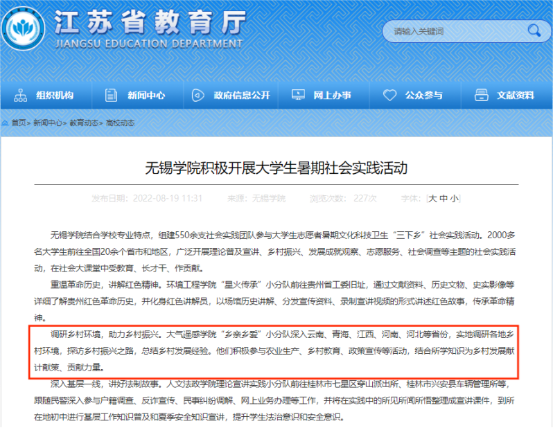 班级成员100%参加社会实践,在社会实践期间,同学们积极投身于志愿服务、乡村教育、政策宣传等活动,进一步宣传了党和国家的各项政策。其中班级社会实践团队“大气与遥感学院’乡亲乡爱’小分队”社会实践活动被江苏省教育厅报导,取得了良好的成效。