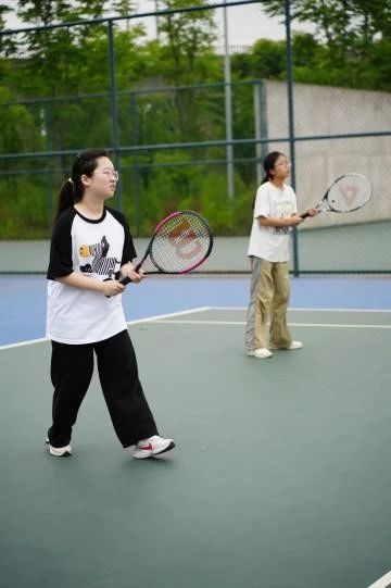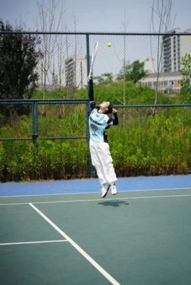 网球场上,他们高高跃起,用尽全身力量挥拍。随着“嗖”的一声,球在空中划出一道完美弧线,准确地落入对方半场。