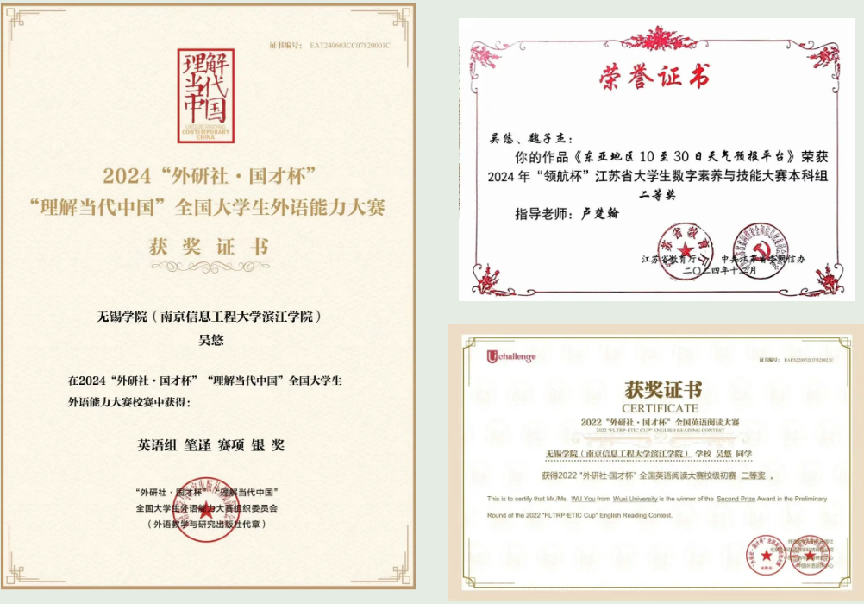 两年稳居专业前6%,其中专业排名第二。曾获国家奖学金、校三好学生、校优秀共青团员等荣誉称号。吴悠,无锡学院大气与遥感学院大气科学专业2022级本科生,汉族,中共预备党员。综合测评成绩连续科研方面,获2024年“领航杯”江苏省大学生数字素养与技能大赛本科组二等奖、2025年全国大学生英语竞赛(NECCS)C类三等奖、昇腾A1创新大赛2024江苏区域高校赛道三等奖。对待工作一丝不苟,曾在大气与遥感学院官微编辑部任职,独立完成推文30余篇;积极投身于社会实践活动,前往江西南昌、井冈山等多地进行红色文化宣讲,所在团队荣获校暑期“三下乡”团队一等奖、“优秀调研报告”等荣誉。