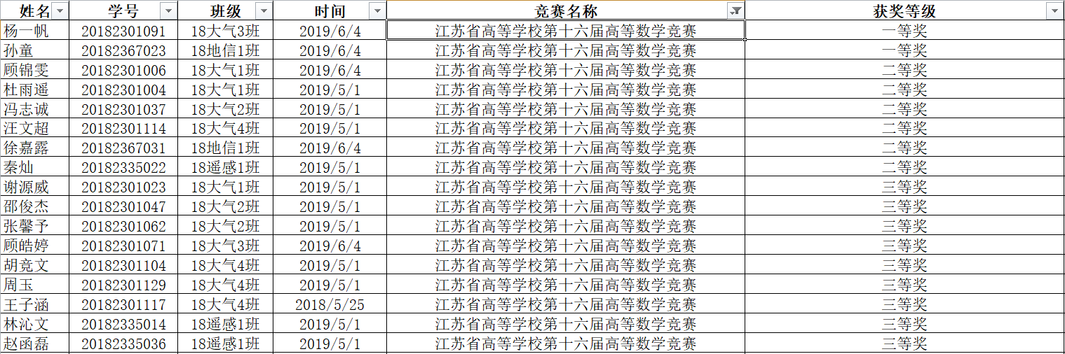 江苏省高等学校第十六届高等数学竞赛获奖名单