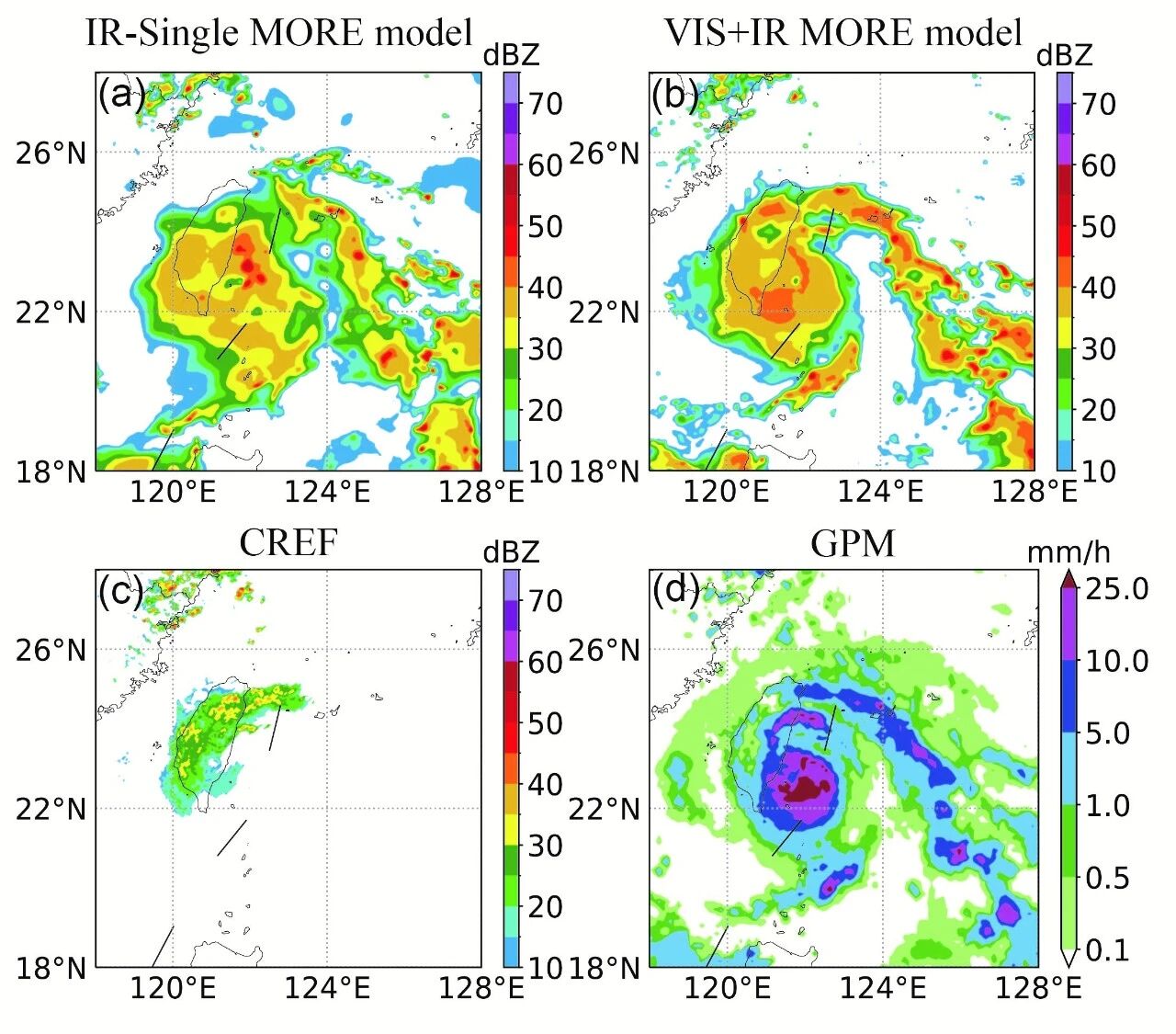图1.一次台风降水过程的(a)-(b)重建雷达回波和(c)真实的地基雷达回波,以及(d)GPM降水产品的比较。